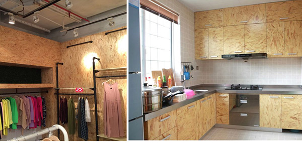 OSB板加工后取代細木工板、三合板、五合板、建筑模板、防火板、裝飾板以及中密度纖維板。實木地板與龍骨間的襯板,或制成復合木地板的基材。家具廚具的結構板。房屋建筑用襯板、室內嵌板、隔熱板、吸音板、天花板、墻板。營建用擋土板、溝渠模板、墊板等等。將OSB板表層貼單面后,可用于家具制造用的素板、抽屜底板、箱、盒、櫥柜隔板、樓層板、床板等。OSB板相比于膠合板,中密度纖維板以及細木工板等板種,其線膨脹系數小,穩定性好,材質均勻,握螺釘力較高,其刨花是按一定方向排列的。