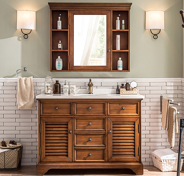 實木類浴室柜是以蒸餾脫水后的實木為基材,經過N道防水處理工藝加工而成的柜體。款式自然、古樸、雍容華貴,能充分體現這人的家具檔次和身份的尊貴,但是對所處環境的要求很高,防水性能較低,且容易干燥。這種材質的浴室柜得選工藝好,且品質感好的大品牌。